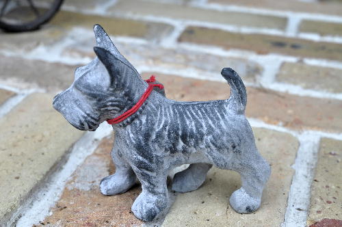 テリアの置物が入荷しました。サイズ ヨコ13cm、タテ11cm です。玄関などちょっとしたアクセントにいかがですか。アンティークの風合いを出すために加工や研磨などを施しています。 人気のテリアのデザインです。商品によって加工の程度は異なりますが、商品の特徴としてご理解いただきその風合いをお楽しみください。