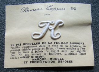 フランス・パリの手芸屋さん(メルスリー)から入荷しました。 モノグラムレター”K" サイズ3x1.8cm ご希望のアルファベットを1枚から販売いたします。