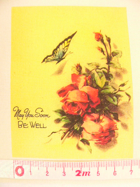 ”May You Soon BE WELL”アメリカのフラワーシリーズを生成のシーチングに転写しています。1枚のサイズ約12cmx10cm 柄のサイズ9.3x7.2cm カルトナージュやパッチワークにいかがですか?額に入れてもおしゃれですね。 デザインやメッセージを楽しんでください。