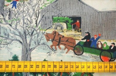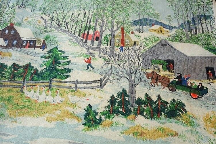 アメリカ・ニューヨークのテキスタイルディーラーの紹介です。 アメリカのフォークアート画家 グランマモーゼス Grandma Moses ヴィンテージファブリック バーククロス『Early Spring Time』 サイズ119cmx225cm