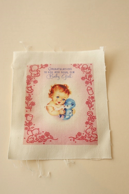生成のシーチングコットンにヴィンテージデザインを転写プリントされたものです。綿100% サイズ10cmx12cm 柄のサイズ7.8cmx9.5cm