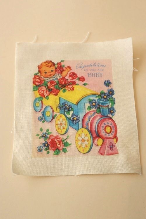 生成のシーチングコットンにヴィンテージデザインを転写プリントされたものです。綿100% サイズ10cmx12cm 柄のサイズ7.5cmx8.0cm