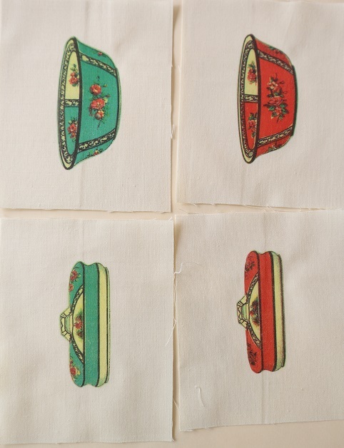 生成のシーチングコットンに転写プリントされたものです。イギリス・ヴィクトリアンデザイン 11枚セット パッチワークやポーチなどのアクセントにお使い下さい。サイズピッチャー7.6cmx7.5cm ボウル8.0cmx3.7cm 横長の小物入れ 7.1cmx2.8cm 丸型 5.5cmx4.1cm バケツ型6.8cmx7.0cm