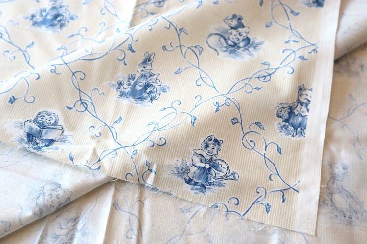 アメリカ・ニューヨークのヴィンテージテキスタイルディーラーの紹介です。アメリカ製ヴィンテージファブリック Kaufmann 綿100% Beartrix Potter サイズ137cm 50cmからカットいたします。