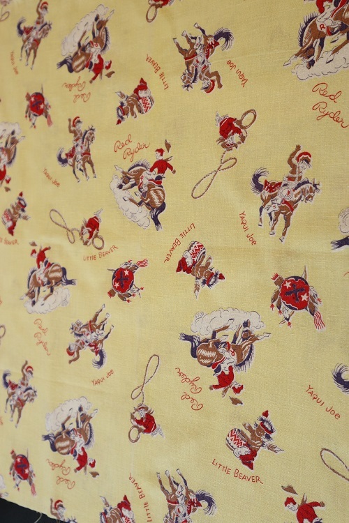 アメリカ・ニューヨークのヴィンテージテキスタイルディーラーの紹介です。アメリカ製ヴィンテージフィードサック カウボーイ サイズ 53cmx45cm 価格はご予約価格です。