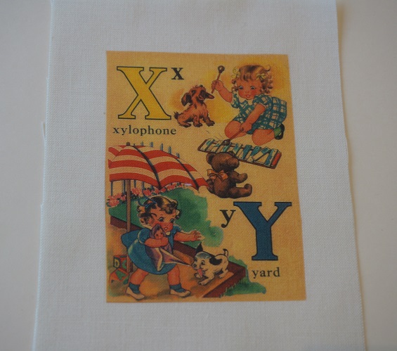 アメリカのアルファベットシリーズを生成のシーチングに転写しています。 生地のサイズ約10.0cmx12.0cm 柄のサイズ 約6.3cmx9.0cm カルトナージュやパッチワークにいかがですか?額に入れてもおしゃれですね。デザインやメッセージを楽しんでください。
