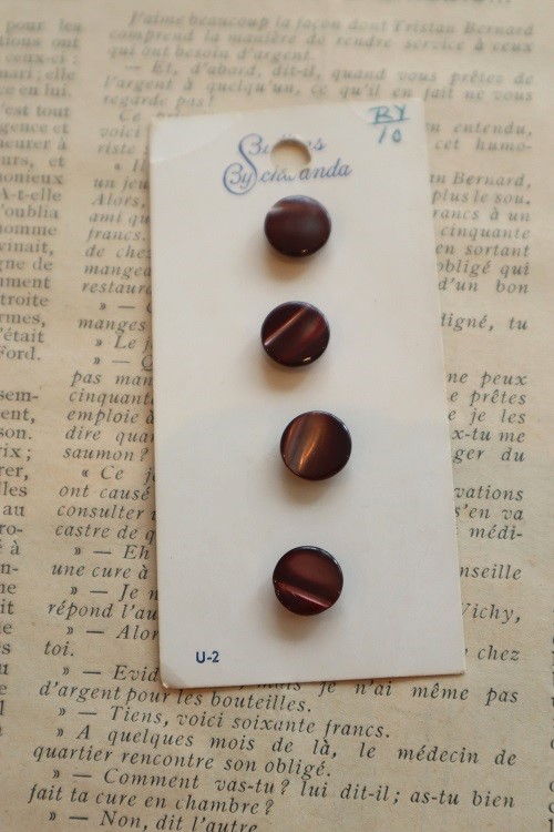 アメリカ・ニューヨークのヴィンテージストックです。 ドイツ製ヴィンテージボタン 4個シート付 サイズ直径1.1cm 洋服やバッグなどのアクセントに、また、アクセサリーやスクラップブッキングなどにおすすめです。 ヴィンテージなので、組成表示はわかりかねます。