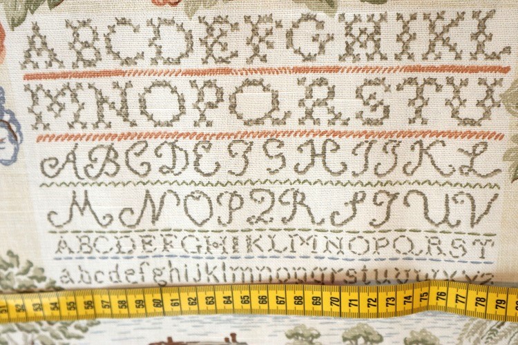 アメリカ・ニューヨークのヴィンテージディーラーからの紹介です。アメリカ製ヴィンテージファブリック 刺繍のデザインです。 アルファベットサンプラー 生地幅138cm 138cmx70cmからカットいたします。1リピート約70cm