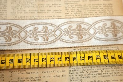 りぼんディーラーから届きました。 フランス製ヴィンテージリボン ジャガード リネン80% 綿20% サイズ幅42mm フランスのインテリアアイテムメーカーなどがクッションなどに使用していました。 50cmからカットいたします。 何mかご希望の場合は、カットせずにお送り致します。