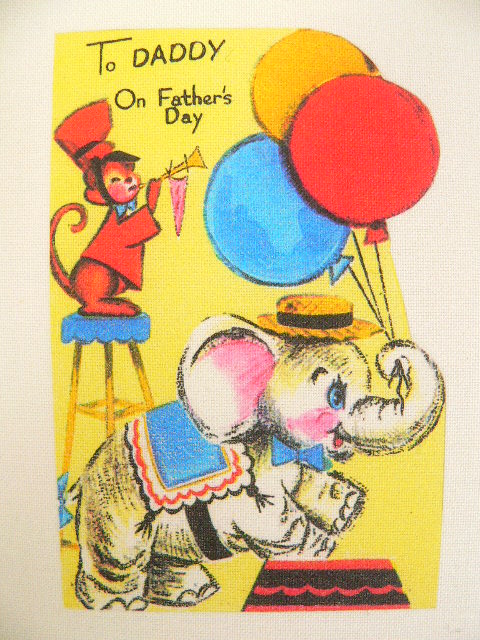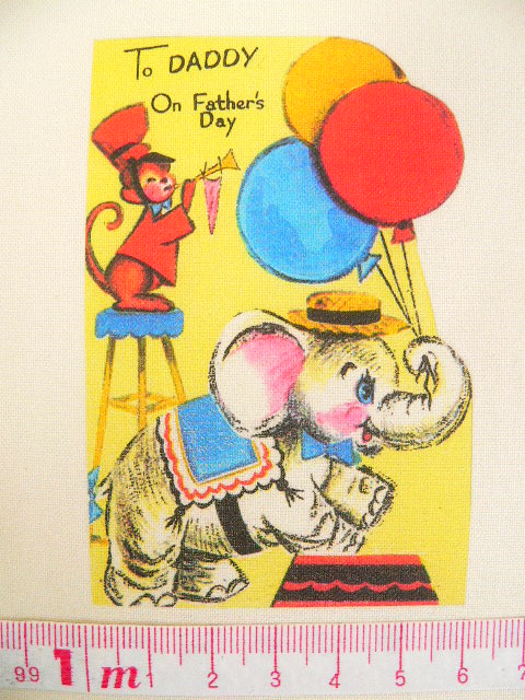 ”TO DADDY On Father's Day ”アメリカのサーカスのデザインを生成のシーチングに転写しています。1枚のサイズ約12cmx10cm 柄のサイズ 9.2x6cm カルトナージュやパッチワークにいかがですか?額に入れてもおしゃれですね。デザインやメッセージを楽しんでください。